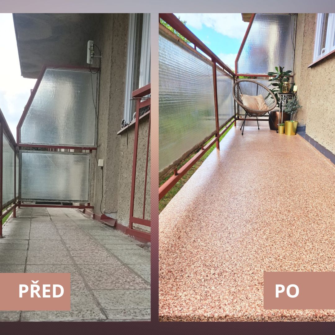 Zřejmě nejoblíbenější varianta renovace balkonu v současné době. Kombinace pružné polyuretanové hydroizolace, do které jsou vsypány barevné chipsy dle výběru a zalakovány průhledným polyuretanovým lakem.