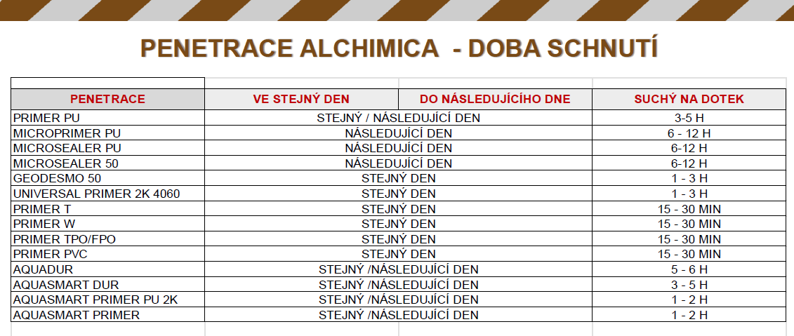 Která penetrace je na jaké bázi? Která jak dlouho schne? Koukněte do tabulek níže. Doba schnutí je orientační (udává se při teplotách 20°C, závisí dále také na vlhkosti a dalších podmínkách).